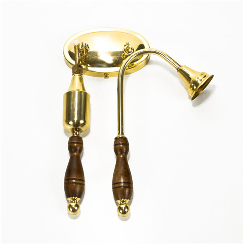 Eszköz gyertyák meggyújtásához és oltásához. Elegáns sárgaréz akasztóra rögzítve. A gyújtónak beépített olajtartálya van.