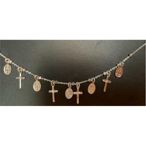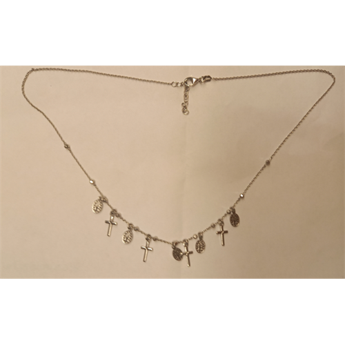 Az ezüst nyaklánc 42 - 45 cm hosszú (állítható), 5 darab ezüst Csodás Mária érem és 4 darab ezüst kereszt medállal.