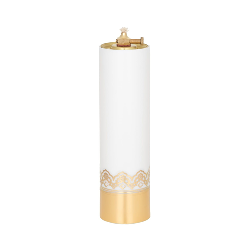22 cm magas, 6,5 cm átmérőjű fehér olajgyertya. Az olajgyertya és a tartály műanyagból, a tartály fedele fémből készült.