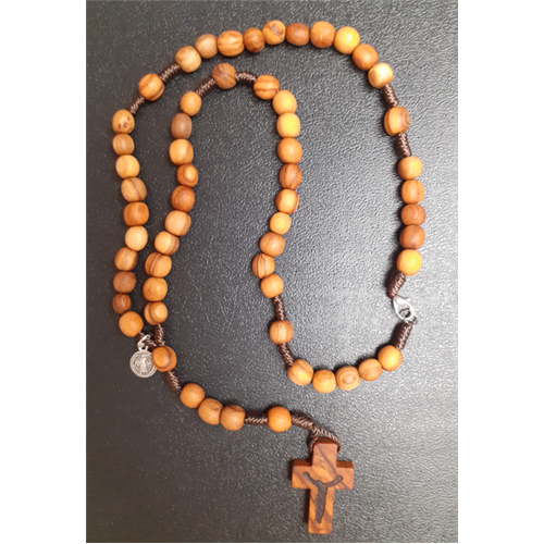 Zsinórra fűzött karabíneres rózsafüzér, 8 mm-es barna olajfafa gyöngyökből, fém Szent Benedek éremmel és olajfa Benedek keresztel a végén.