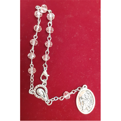 Hagyományos tizedes rózsafüzér 11 db, fazettált műanyag (6 mm) szemből készült, karabínerrel ellátott, végén Szent Kristófot ábrázoló medállal.