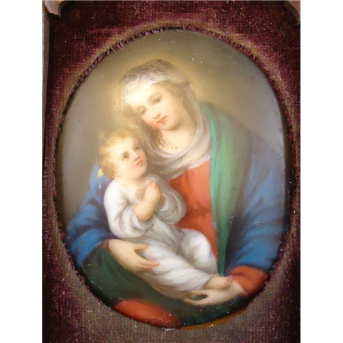 Porcelánra festett miniatűr Madonna kép faragott neogótikus keretezéssel, sérült, hiányos, teljes méret 33*15 cm.