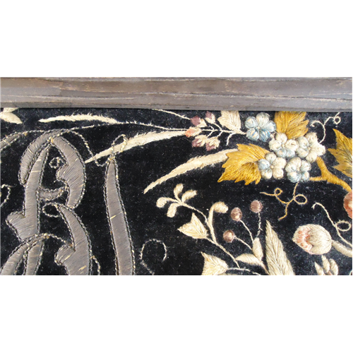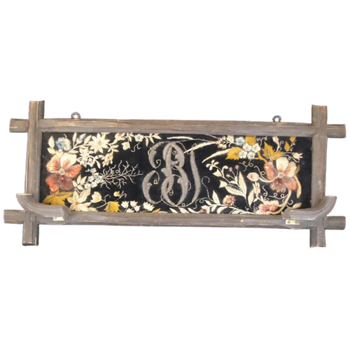 Faragott keretben hímzett fali dísz, hiányos, régen törölközőtartó volt.