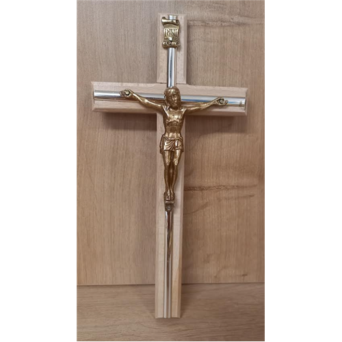 Feszület, fém korpusszal natúr - fa (ezüst csíkkal, 24 cm)