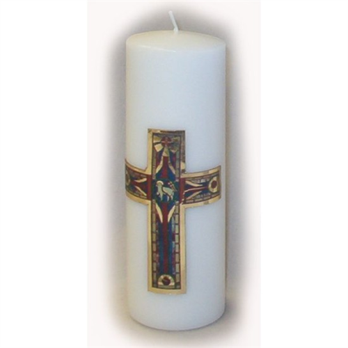 Oltárra való húsvéti gyertya, aranyozott viasz kereszt dísszel. A gyertya mérete hosszúság 180mm* átmérő 60mm. A gyertya díszítése aranyozott viaszból készült.