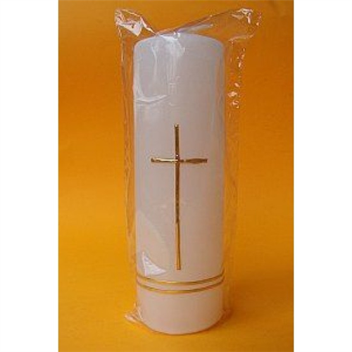 Oltárra való húsvéti gyertya. A gyertya mérete hosszúság 200mm* átmérő 60mm. A gyertya díszítése aranyozott viaszból készült.