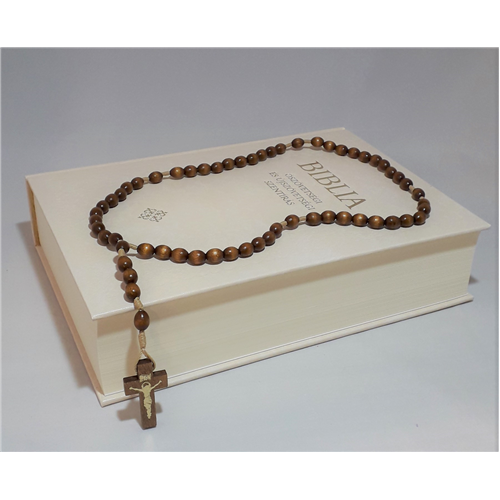 Hagyományos vagy öttizedes kötött, fa rózsafüzér.