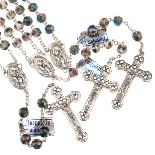 A zománcozott gyöngyök és ezüst szálak kivételes minőséget kölcsönöznek a rózsafüzérnek.