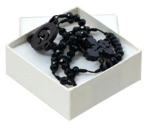 Hagyományos vagy 5-tizedes rózsafüzér 59 db fazettált fekete üveg gyöngyből készült. A gyöngyök mérete: kb. 5 mm átmérőjű. A szemek fekete színű zsinórral vannak összekötve.A középérem fából készült.