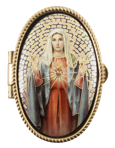 Rózsafüzértartó, fém, ovál - (Mária szíve szentképpel, 5x7 cm)