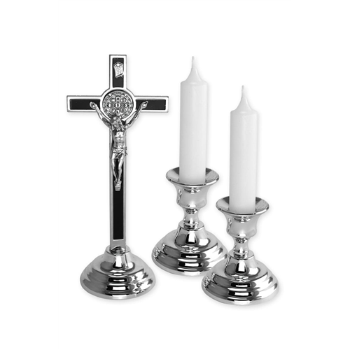 Házioltár, ezüst (álló Szent Benedek feszület 19 cm + 2 gyertyatartó gyertyával)