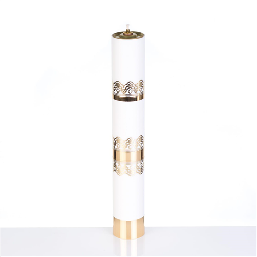 40 cm magas, 6,3 cm átmérőjű fehér olajgyertya. Az olajgyertya és a tartály műanyagból, a tartály fedele fémből készült.