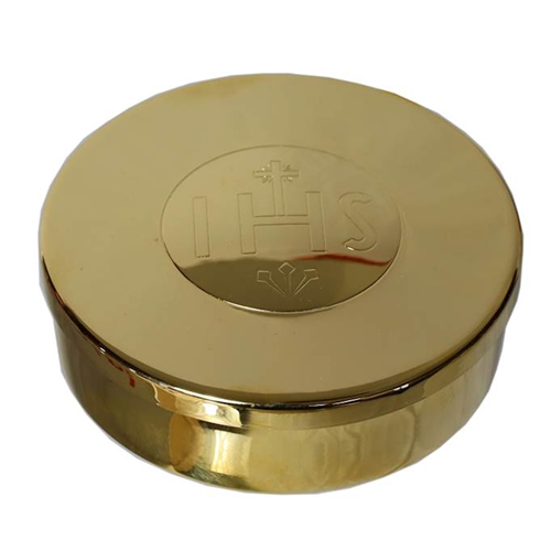 Aranyozott ostyatartó nyitható fedéllel. Az ostyatartón gravírozott "IHS" felirat látható.