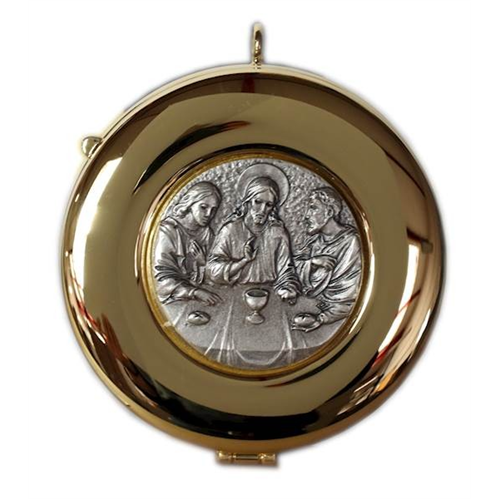 Aranyozott ostyatartó nyitható fedéllel. Az ostyatartón gravírozott "IHS" felirat látható.