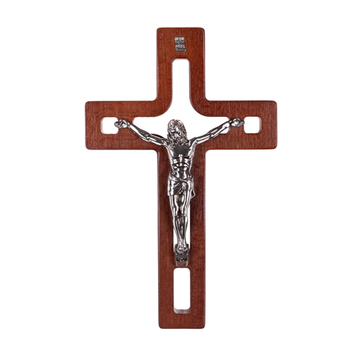 Kereszt, fa áttört - fém korpusszal (barna, 18 cm)