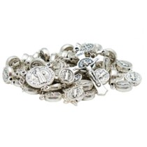 Szent Benedek érmet ábrázoló fém gyöngyökből, Szent Benedek középéremből és Szent Benedek fém feszületből készült. Hagyományos vagy 5-tizedes rózsafüzér 59 db, fém, kerek, a Szent Benedek érmet ábrázoló gyöngyökből áll. A szemek mérete: 6 mm. A szemek ezüst színű lánccal és dróttal vannak összekötve. Nyakba akasztható. A szemek, a középérem és a feszület fémötvözetből készült, mely a felületkezelő eljárás során kapta az ezüst színű bevonatot. A rózsafüzér alkotóelemei Olaszországban készültek.