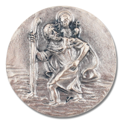 40 mm átmérőjű, ezüst színű, öntapadós, mágneses, kerek érem, mely Szent Kristófot ábrázolja, akinek a bal vállán a gyermek Jézus ül és jobb kezével botjára támaszkodik.